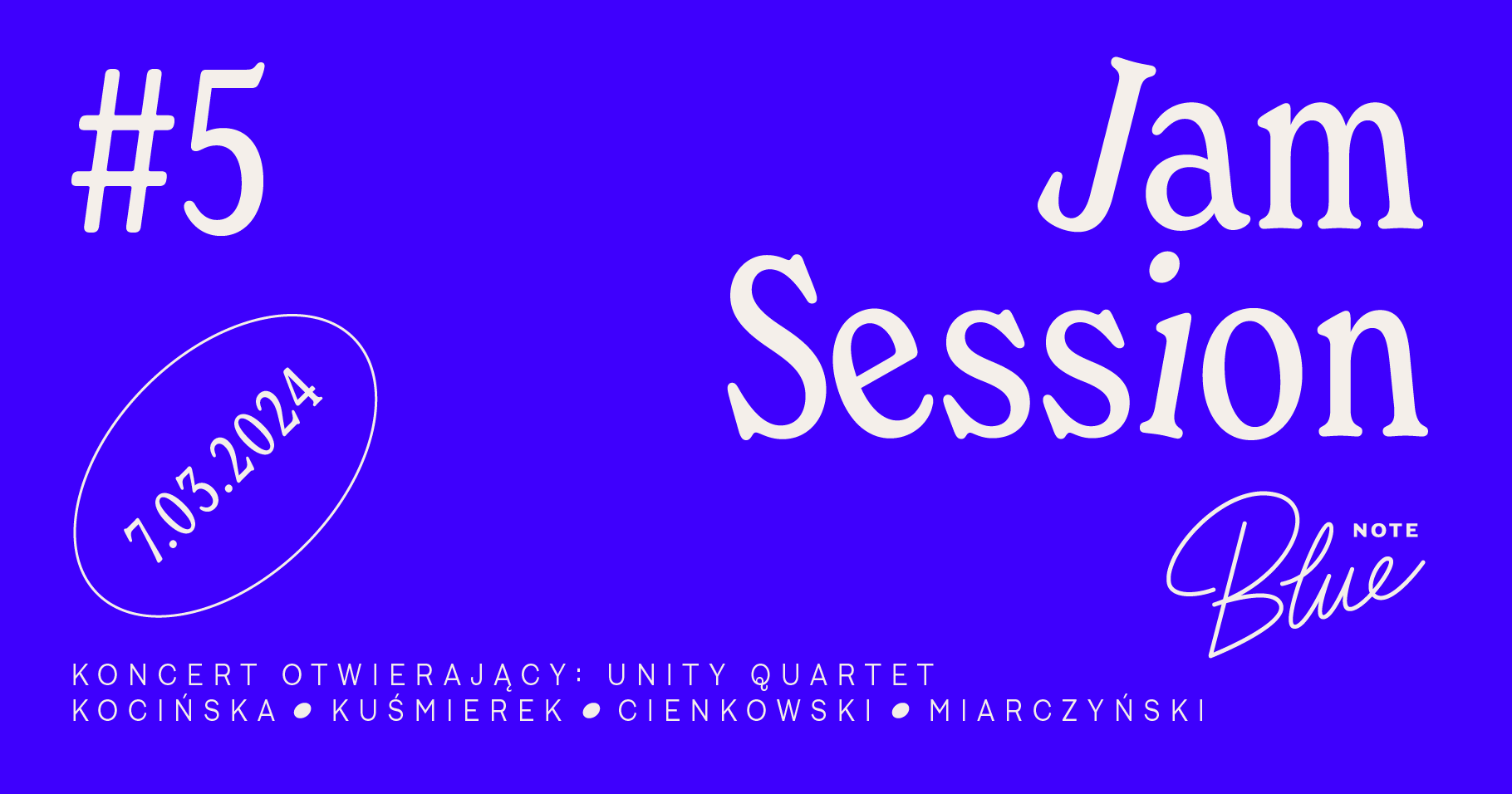 Kolejny raz zapraszamy do Blue Note na wspólne granie. Tym razem koncert otwierający jam session zagra Unity Quartet! Muzycy o bardzo różnych charakterach i sposobach ekspresji, w myśl zespołowej współpracy, zaprezentują kompozycje lub aranże każdego z grających, które przybliżą ich charakter, marzenia oraz inspiracje. Artyści wchodzący w skład kwartetu grają także w innych znanych w Wielkopolsce projektach m.in. Kwaśny Deszcz, Storks & Ancymons, Unleashed Cooperation czy Skicki-Skiuk. Dobór takich osobowości gwarantuje wielobarwny i wielogatunkowy występ – od subtelnych i pięknych ballad do żywiołowej muzyki improwizowanej.